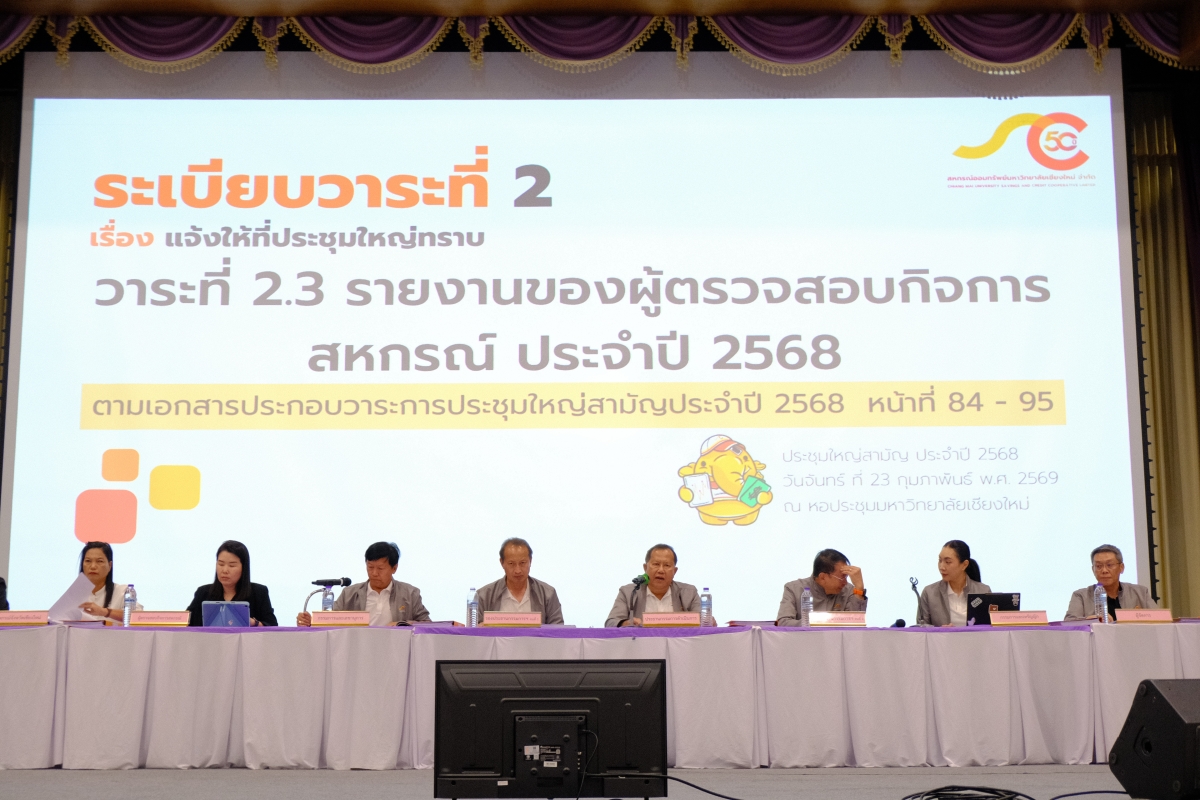 เมื่อวันที่ 23 กุมภาพันธ์ 2569 เวลา 13.00 น. สหกรณ์ออมทรัพย์มหาวิทยาลัยเชียงใหม่ จำกัด ได้จัดการประชุมใหญ่สามัญประจำปี 2568 ขึ้น โดยมี รองศาสตราจารย์ นายแพทย์อำนาจ อยู่สุข ประธานกรรมการดำเนินการ เป็นประธานในที่ประชุมใหญ่ มีสมาชิกเข้าร่วมประชุมทั้งสิ้น 1,696 คน