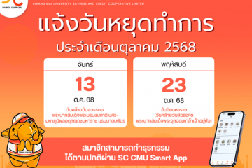 สอ.มช. แจ้งวันหยุดทำการ ประจำเดือนตุลาคม 2568 วันจันทร์ที่ 13 ตุลาคม 2568 วันคล้ายวันสวรรคต พระบาทสมเด็จพระบรมชนกาธิเบศรมหาภูมิพลอดุลยเดชมหาราช ...